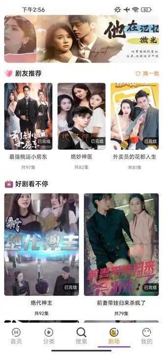 进入主界面后,可查看“剧友推荐”“好剧看不停”等栏目,系统会根据热门趋势推送高分短剧。