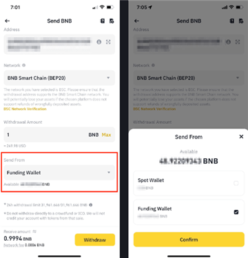 2.选择要提现的加密货币,此处以BNB为例。然后点击【通过加密货币网络发送】。