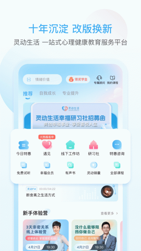 每日能量指引、女性赋能课、每周主题直播、海量有声书、大师课等课程免费学,还可参与线下工作坊、幸福研习活动、互动学习社群等。