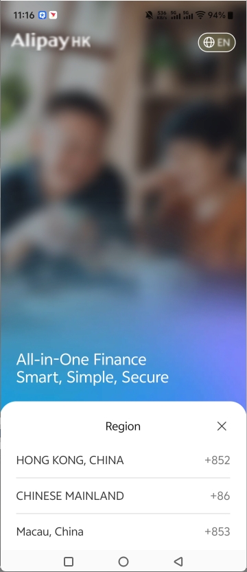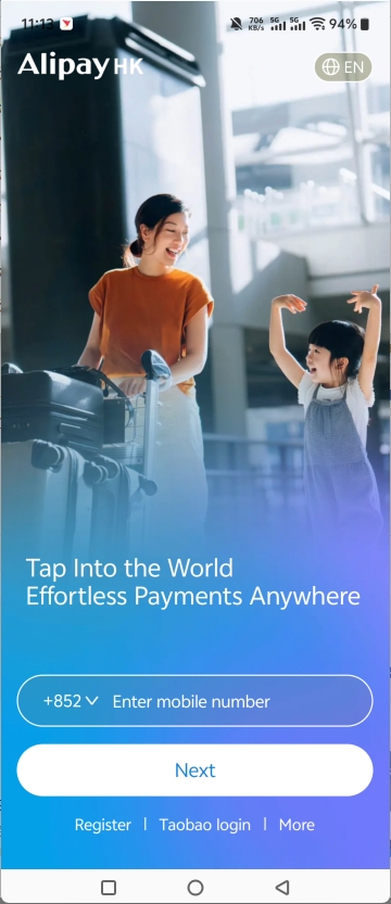 1、在本站下载并打开香港支付宝App后点击下方【注册】按钮。这里我们点击右上角【EN】切换语言,选择简体中文。