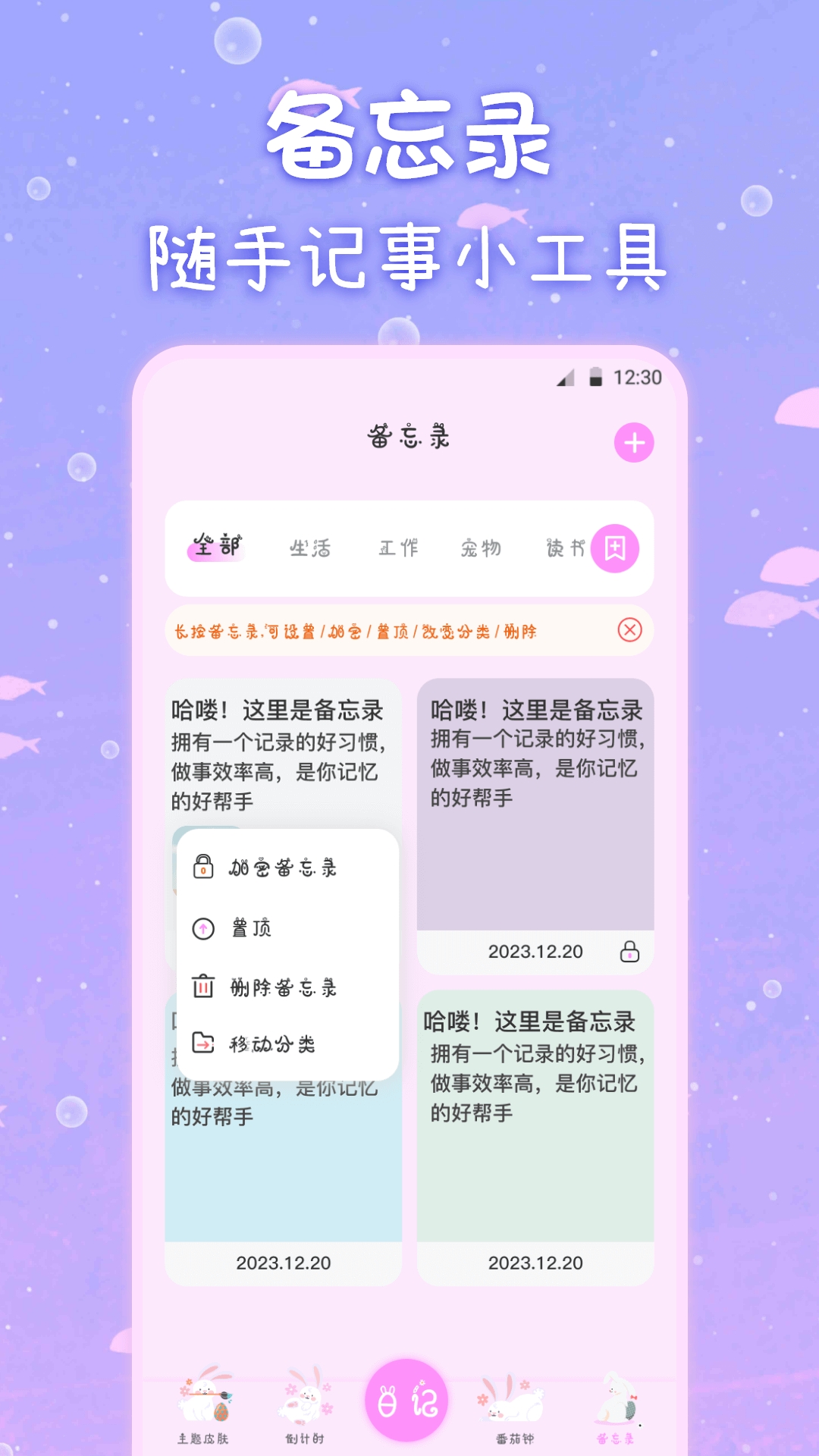 萌趣备忘录app是一款非常好用的备忘录软件,用户在日常生活中遇到的暖心时刻或悲伤时刻都可以进入该备忘录中进行记录,拥有多种可爱的主题皮肤可供选择,轻松记录各项重要事宜,软件还有贴心提醒功能避免你忘记某件事。
