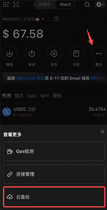 当您创建完成钱包后,请点击下图所示位置进行云备份,可确保您在更换设备时不易遗失资产。