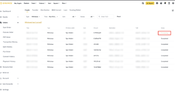 登录币安账户,将鼠标悬停在钱包图标上,然后点击【订单】-【钱包历史】查看您的加密货币提现记录。