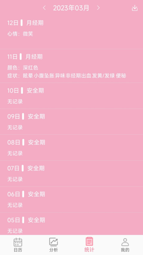 用户可以记录每个周期的症状,如情绪变化、体重变化、疼痛程度、皮肤状况等。