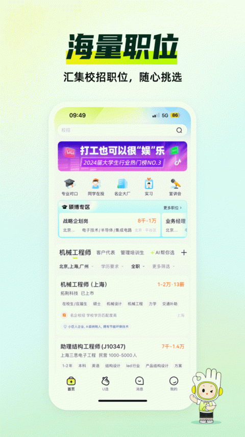 应届生求职app是专为大学生和应届毕业生打造的一站式求职服务平台,提供全面、专业、可靠的校园招聘信息服务。平台汇聚海量优质岗位资源,涵盖校园招聘、名企实习、宣讲会、招聘会等多种求职渠道,与多家知名人力资源公司建立深度合作,保证所有职位信息真实可靠。通过智能推送和个性化推荐,帮助用户第一时间获取最新招聘动态,精准匹配适合的职位机会。不管是寻找实习、校招岗位,还是了解行业趋势,应届生求职APP都能提供权威的求职指导和丰富的就业资源,让毕业生轻松掌握职场先机,安全高效地完成从校园到职场的过渡,是大学生求职路上不可或缺的得力助手。