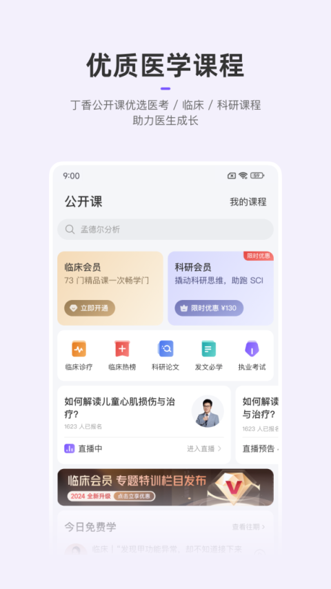 临床课程、科研课程、医考课程、各种公开课尽在掌握。