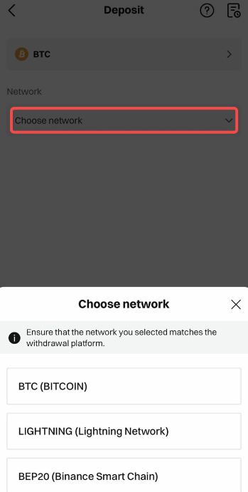 第4步:您选择的充值网络必须与转出加密货币的平台相同(如 Bitcoin、Bitcoin Lightning、BEP-20、ERC-20 等)。请务必谨慎,如果网络选择有误,可能会导致资产损失。
