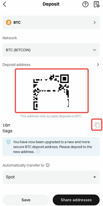 第5步:选择偏好的代币和网络后,我们将生成一串地址和一个二维码。您可以选择使用其一来完成充值。