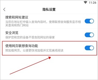 5、在“隐私设置”窗口中,选择“使用网页联想查询功能”栏目。