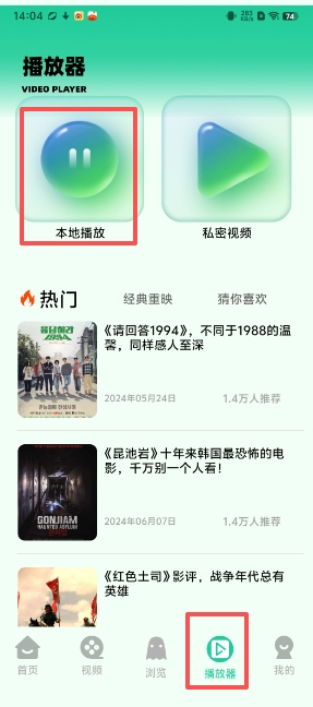 第二步:点击底部“播放器”,找到页面上的“本地播放”