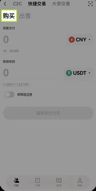 一、打开pi派币首页-点击C2C买币-快捷买币-点击购买-选择需要购买的数字资产