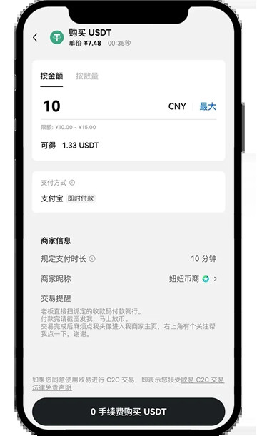 二、选择可交易的商家进行购买-按金额或者数量填写所需的数字资产-注意商家要求的“支付方式”-注意商家要求“支付时长”-点击“0手续费买入”-订单生成点击“获取付款详情”-按照“商家账号”进行支付-付款成功后点击“我已支付”-点击“确认已转账”-商家收到款会进行放币
