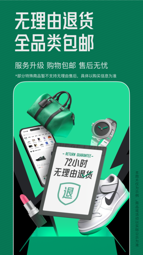 从此以后,购买95分商品,享包邮服务,退货享72小时无理由服务。