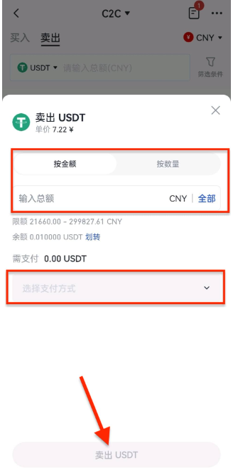 3、在“卖出”页面中,输入数量/金额,并选择支付方式,点击下方“卖出USDT”。页面下方会跳出二次确认窗口,确认卖出信息无误后,点击“ 立即卖出”,并输入资金密码,进行下单。