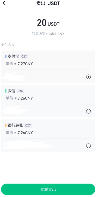 币种选择USDT,输入卖出数量,会自动显示对应兑换金额,点击“卖出USDT”后,选择您的收款方式,页面详情如下: