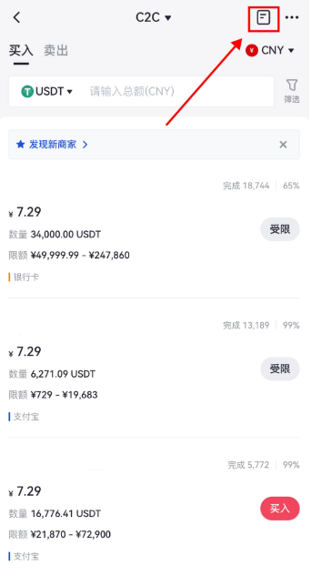 4、订单匹配后,您可以点击页面上方“快捷交易”切换到“C2C”界面,进入订单页面查看订单的详情。