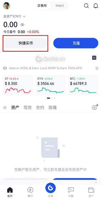 1,打开Gate.io手机App,在首页,可以看到 “快捷买币” 便捷入口。