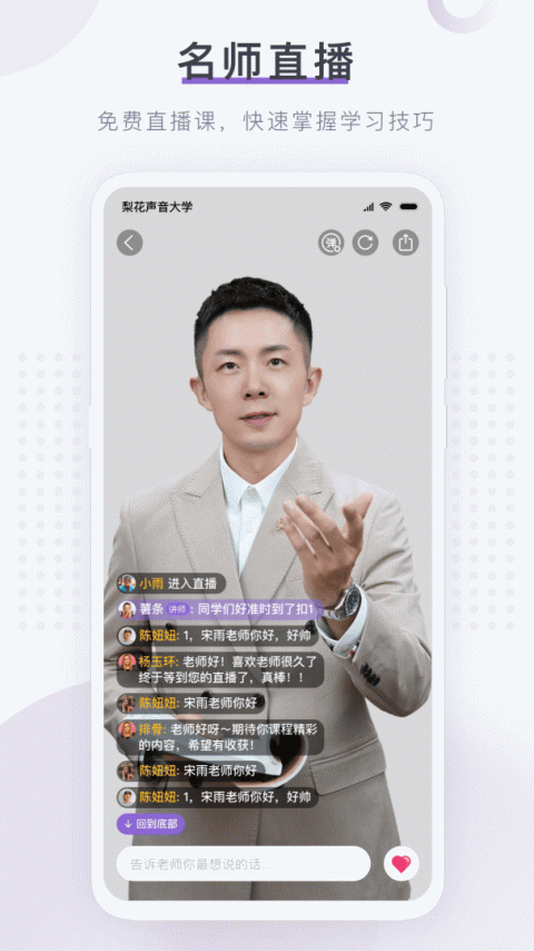 梨花声音研修院app官方版是一款专注于声音美化的在线学习应用,帮助用户提升语音技能和音质。这款软件提供多样化的课程资源,采用视频形式让learning更加直观,以便更好地理解老师的讲解。通过参与小班教学和名师指导,你将获得个性化的声音优化建议。平台上还有丰富的活动,让你可以与老师和其他学员进行面对面的交流,及时解答疑问,是想要改善发音、增强表现力还是寻找声音变现的机会,梨花声音研修院都能满足你的需求。赶快下载体验,把你的声音魅力提升到新的高度!
