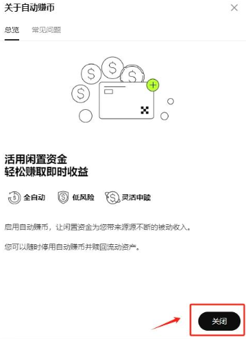 2、在弹出的页面中,点击右下方的【关闭】就完成自动赚币关闭操作了;