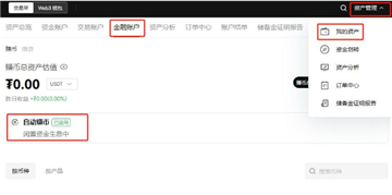 1、打开欧易交易所(点击注册),点击首页右上方【资产管理】,选择【我的资产】,选择【金融账户】。点击【自动赚币】