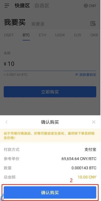 点击首页下方法币按钮,进入法币交易区,选择快捷区,我要买,选择要购买的币种,输入要购买的总金额或要买的币种数量,点击立即购买。