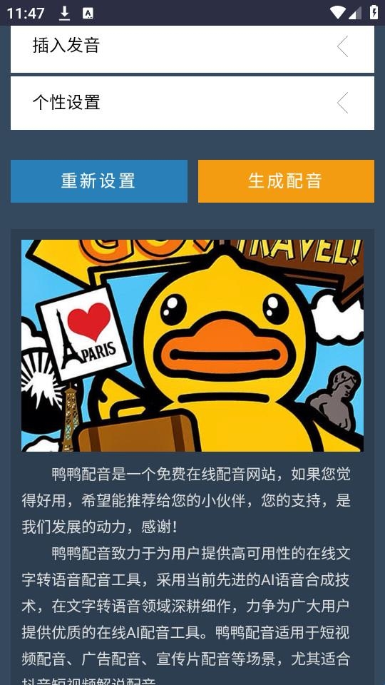 3、素材丰富:小鸭肩扛海量样音模板,多种文本范例和背景音乐,迎合用户多样需求,打造专属于你自己的独一份配音效果。