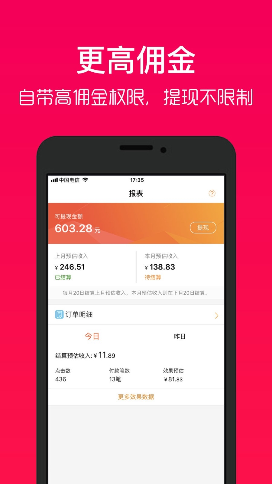 2、每一键商品的佣金都可以查看,自由选择分享,自己的收益详情一键查看,所有信息一目了然。