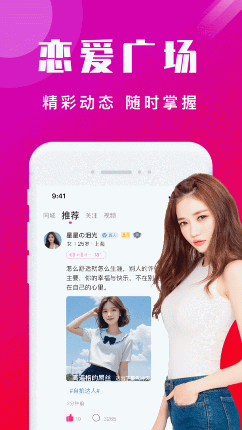 本地陌交友app是一款专注于同城社交的免费交友平台,致力于为用户打造真实的社交体验。在这个充满活力的社区里,可以浏览同城用户发布的丰富多彩的生活动态,通过个性标签快速发现与自己志趣相投的朋友。平台采用智能匹配算法,根据用户的兴趣爱好、生活方式等特征进行精准推荐,大大提高了结识理想伴侣的机会。作为一款零成本的交友软件,本地陌交友让每个人都能轻松分享日常生活点滴,展示真实自我,同时也能深入了解其他用户的个性特点。不管是寻找知心好友,还是邂逅浪漫情缘,这个平台都能为您提供安全可靠的社交环境。