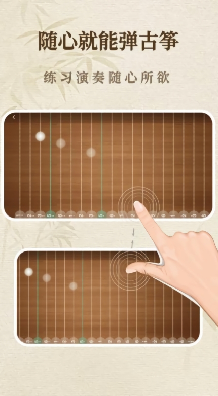 4、高清古筝界面支持多弦同时触控,模拟真实的拔毛感觉,确保演奏流畅自然。