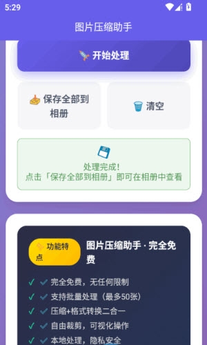 图片压缩助手是一款轻量化的图片处理工具,专为移动端用户打造,具备高效无损压缩、多格式转换、尺寸调整等功能,每一项都是免费开启,所有的图片都支持批量处理,操作零门槛,无需专业修图知识,即可快速的处理图片,可以适配存储扩容、平台上传、社交分享等多场景需求。