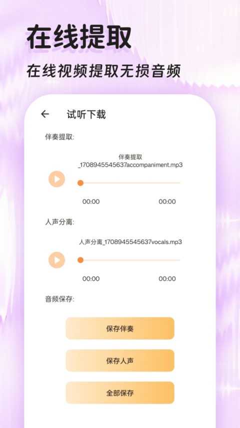精准提取各种音频中的伴奏和人声歌曲以及背景音乐,方便快捷。