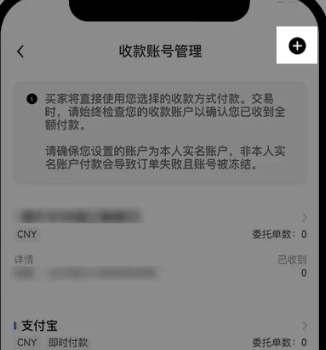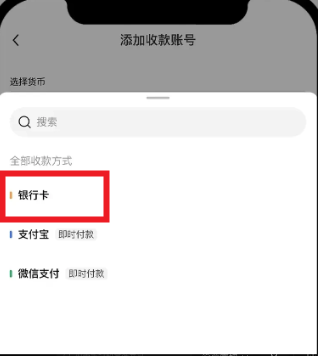 点击右上角“+”—【选择货币】、【收款方式】—选择银行卡,按要求填写相关信息和提示即可完成绑定。