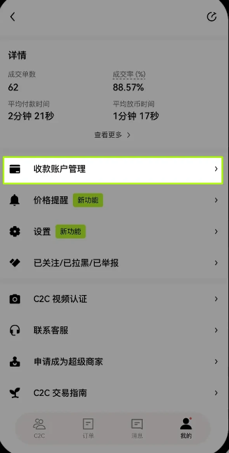 打开etf交易平台App,点击【C2C买币】-右下角【我的】图标-【收款账号管理】。