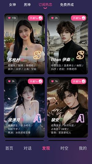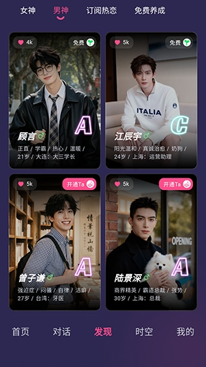 2、角色类型包含成熟爹系、温柔绅士、阳光少年、霸道总裁、冷艳御姐等多种人设,谈吐风格、性格气质各有特色,适配不同陪伴需求。