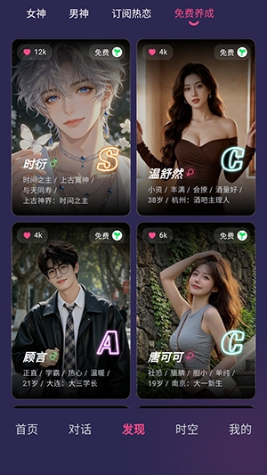 1、平台收录大量风格鲜明的虚拟角色,人设完整饱满,涵盖多种热门类型,风格覆盖全面,轻松挑选心仪的专属聊天伙伴。
