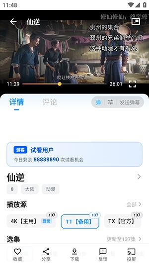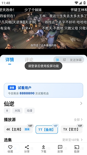 2、在播放页面,提供投屏以及下载功能。