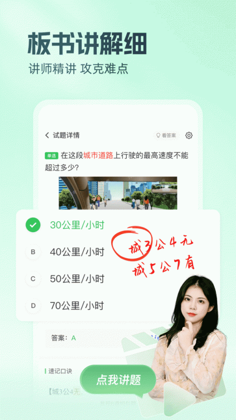 讲师剖析交规试题,讲解驾照考试技巧,提炼速记口诀,知识卡片。