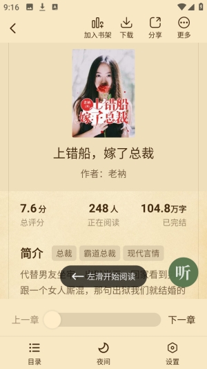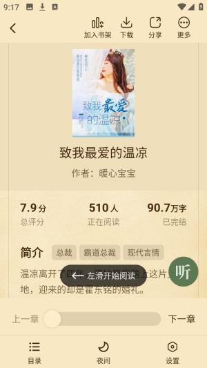 3、点击你喜欢的小说封面进入左滑即可开始阅读。