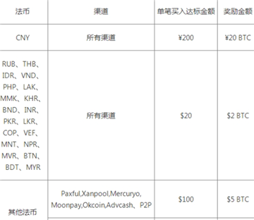 购买数字货币任务: 使用法币购买数字货币的单笔订单金额达标后,可领取比特币奖励。使用不同国家法币、通过不同渠道买入时,任务达标金额和奖励不同。任务将可能动态调整,以下参数仅作为参考: