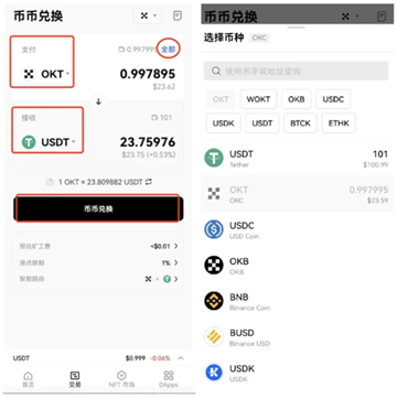 或者您也可以在选择「支付」币种后,点击右上角「全部」,一键输入可交易币种最大量以发起询价。(注:「支付」币种在选择OKT后,系统会在余额中自动保留部分OKT作为gas费以使交易顺利完成。)在选择币种下拉列表中,您可以在上方搜索框中输入想要交易的代币名称或者合约地址搜索代币。