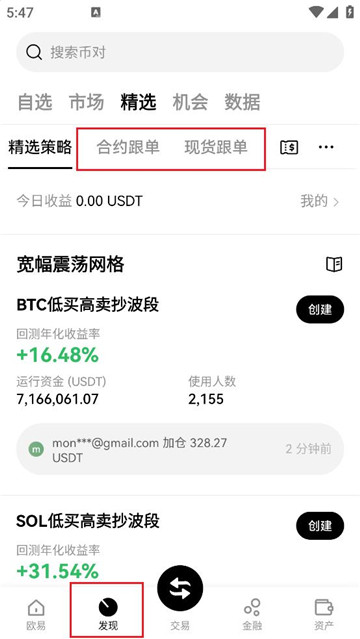 打开OK平台app,点击【交易】栏 -【双向箭头】图标 -【跟单】-【我的跟单】。