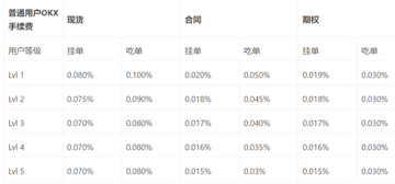 OKX 交易手续费依照用户的VIP 等级而有不同的手续费,如果以LV1 的一般用户而言,现货的手续费落在0.08-0.1%之间,合约和期权则落在0.02-0.05% 之间。
