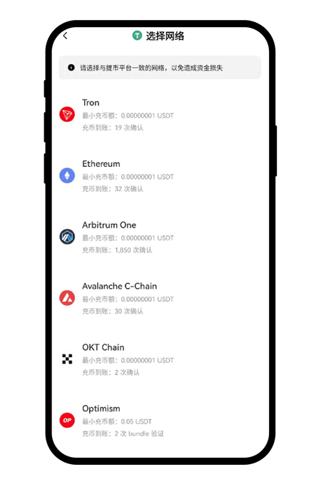 注意:选择充币网络时,其他交易所或钱包【提币/提现网络】要与欧易充币的网络保持一致,例如都为 USDT-TRON (TRC20),否则币会丢失。