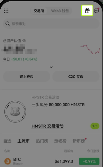 1,打开欧易 App 首页,登录您的账户,点击右上角【邀请好友】图标;