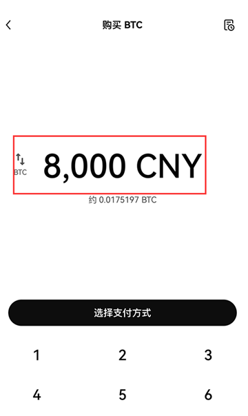 第二步:要购买的币种为BTC,输入需要购买的金额。点击如图所示的按钮即可切换成按币种数量购买。
