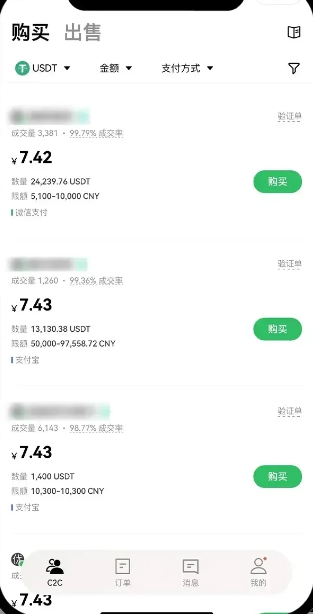 C2C 买币:1)打开 App 首页,点击【买币】- 【C2C 买币】。在购买页面,点击【USDT】可以搜索数字资产,点击【筛选】可以选择委托单类型和支付方式。设置完成后,选出符合条件的商家,点击【购买】。