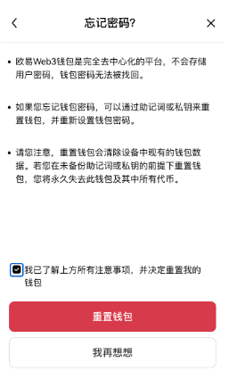 作为非托管、去中心化的多链钱包,欧易Web3钱包不会存储用户的钱包密码,也无法帮你找回密码。你可以通过重新导入助记词或私钥,来重置钱包密码,因此务必备份助记词或私钥。如果未备份,忘记钱包密码意味着资产永久的丢失。