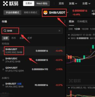 5.搜索柴犬币英文简称SHIB,选择SHIB/USDT交易对,即可看到SHIB实时行情
