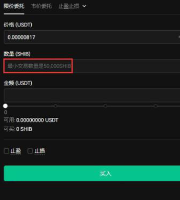 6.填写SHIB购买数量,点击买入,若是卖出,填写SHIB卖出量,点击卖出即可。注意SHIB最小交易数量是50000SHIB