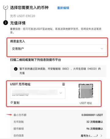 3、在充币详情页,选择【将资金充入】的账户&【复制地址】。